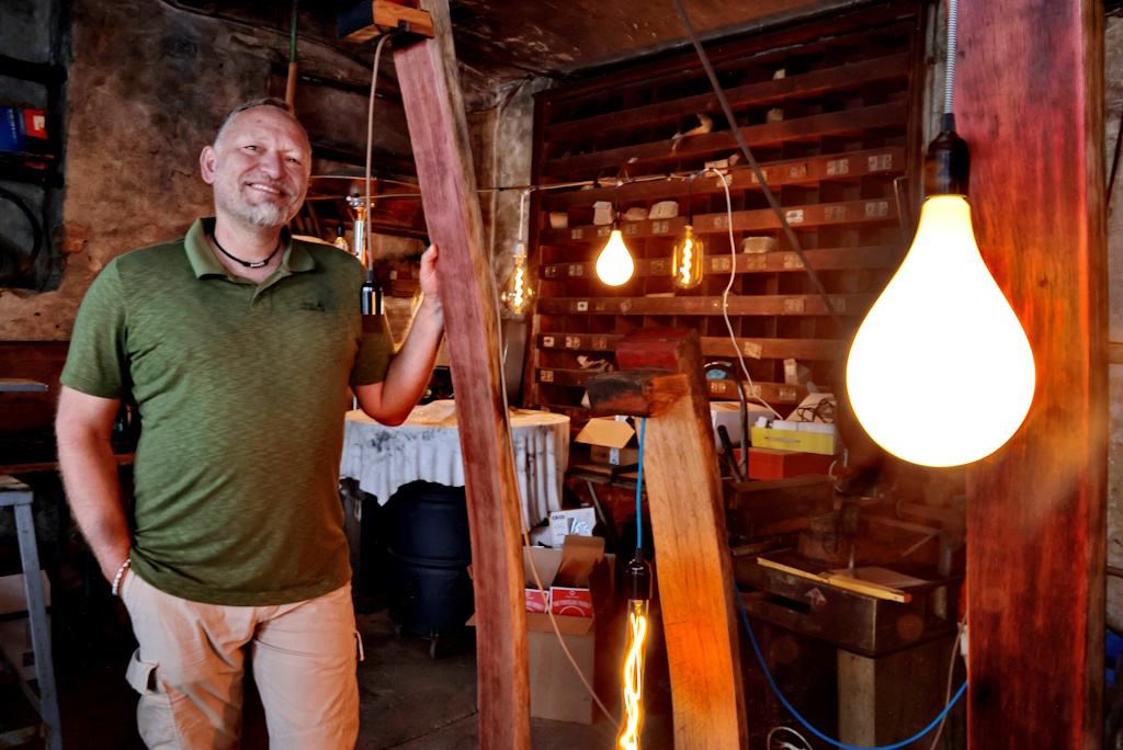 Daher kombiniere ich über 100 Jahre alte Dauben mit Edelstahl, Bakelit und LED-Leuchtmitteln.